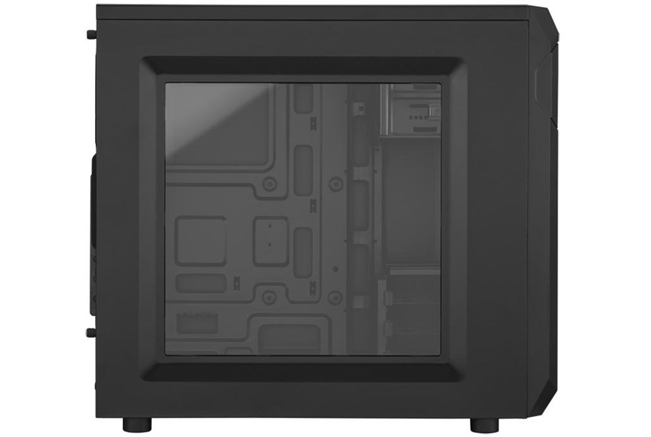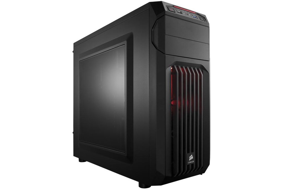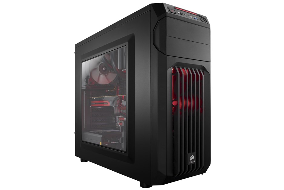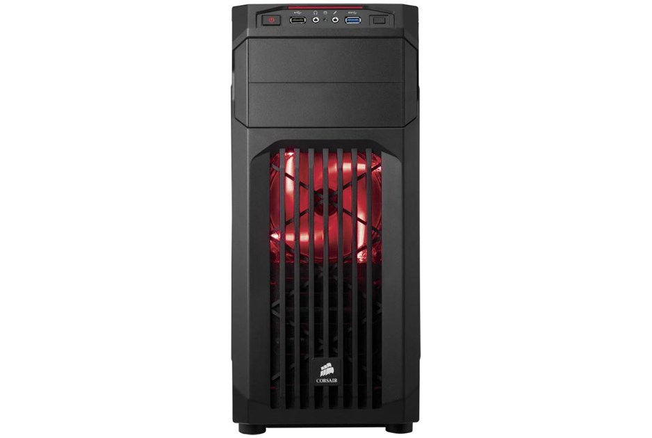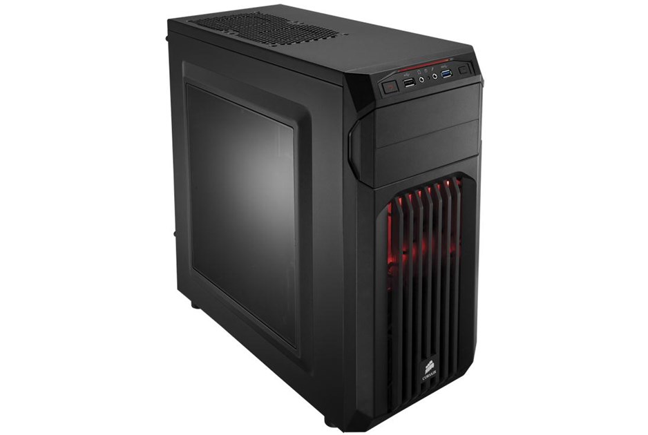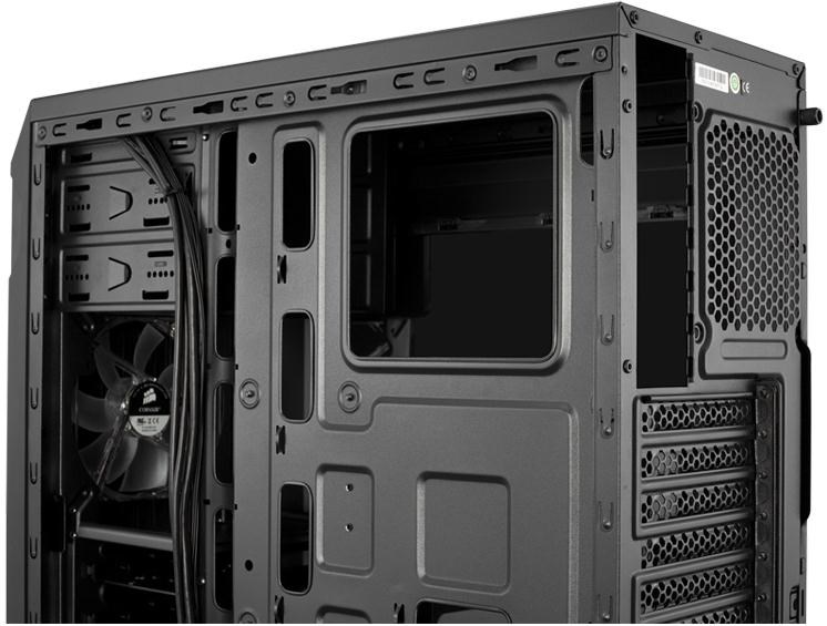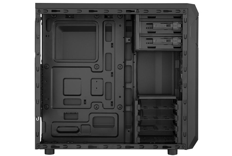 Carbide Series SPEC-01 is proof that great looks, smart design, and durable construction don't need to be pricy, and that basic doesn't need to be boring. You get aggressive styling, a huge side panel window for admiring your components, and an LED-lit front intake fan that draws cool air directly to your graphics cards. Inside, there's room for up to five fans, and the four combination hard drive / SSD trays make storage installation and upgrades quick and easy. Cable routing cutouts help you reduce clutter, and the built-in dust filters help protect your components. Up front, the USB 3.0 connector gets you up to speed with the latest high-performance storage devices. The aggressive look of the SPEC-01 makes it look great on the outside, but there's beauty on the inside of a well-built system, too. The large side panel window lets you show it off. The 120mm front intake fan is bathed in soft LED lighting, and it's oriented to draw cool air directly across your graphics cards. And if you want even more ventilation, you can add a second 120mm fan or even dual 140mm fans. Like all Corsair cases, the SPEC-01 is designed for cooling, so you're covered if you're overclocking, running multiple GPUs, or if you just want more airflow. There are mounting points for up to five fans, including dual front 140mm or 120mm fans, dual 120mm fans on top, and a rear 120mm fan. You might not build a system with four hard drives or SSDs, but with SPEC-01, you can if you want. In addition to the two standard 5.25' optical drive bays, there are four built-in 3.5' / 2.5' combo drive bays for mechanical hard drives or solid-state drives. Builds should be easy, no matter what your budget. 3.5' drive installation is tool-free, and you get cable routing holes for neater-looking builds and better airflow. And, there's a CPU cutout to allow for cooling upgrades without removing the motherboard. The front intake fan filters help keep dust out of the interior, and the front panel has a USB 3.0 port for fast performance from USB flash drives and portable hard drives.
